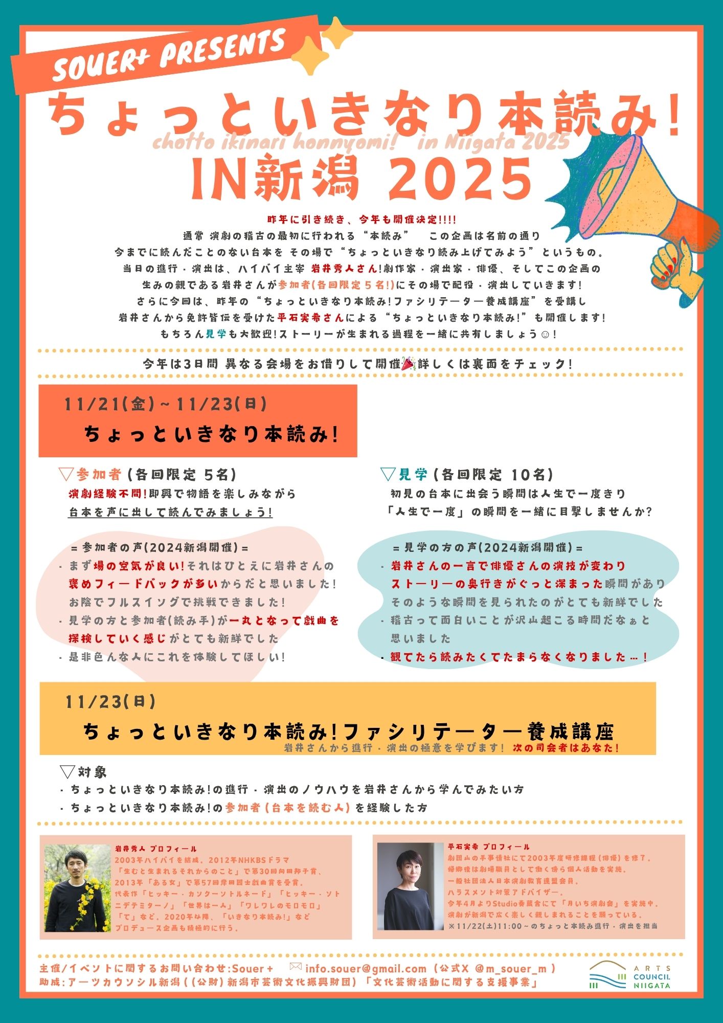 本読み企画の生みの親である岩井さんから、本読み企画を運営/進行するファシリテーターのノウハウを学ぶ講座です。今後、新潟で気軽に演劇を楽しめる場の設定・運営・進行をする機会の創出をめざして、「ちょっといきなり本読み!in新潟」で「参加者」として本読み・配役・演出を体験された方がファシリテートする側の視点を学びます。