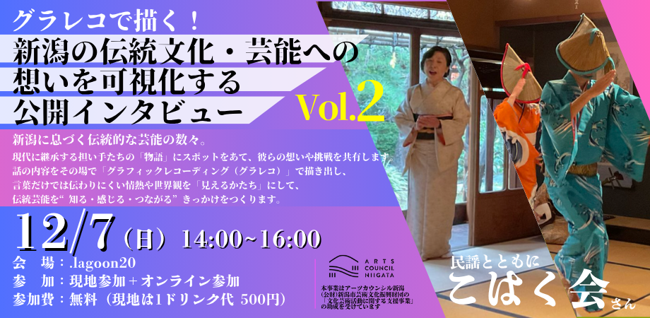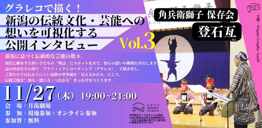 グラフィックレコーディング(グラレコ)をツールとして、豊かなコミュニケーションが生まれる土壌をつくる活動を行っているNiigata Graphic LanDが、新潟の伝統芸能を次世代へ継承する担い手の「物語」にスポットをあて、想いや挑戦を共有する公開インタビューイベントを実施します。このイベントでは、ゲストのお話をその場で「グラレコ」で描き出し、言葉だけでは伝わりにくい情熱や世界観を「見えるかたち」にして、伝統芸能を「知る・感じる・つながる」きっかけ作りをめざします。