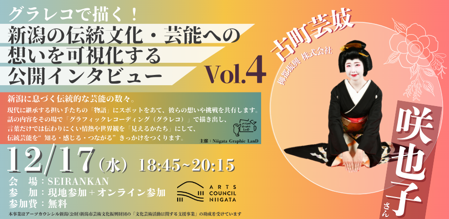 グラフィックレコーディング(グラレコ)をツールとして、豊かなコミュニケーションが生まれる土壌をつくる活動を行っているNiigata Graphic LanDが、新潟の伝統芸能を次世代へ継承する担い手の「物語」にスポットをあて、想いや挑戦を共有する公開インタビューイベントを実施します。このイベントでは、ゲストのお話をその場で「グラレコ」で描き出し、言葉だけでは伝わりにくい情熱や世界観を「見えるかたち」にして、伝統芸能を「知る・感じる・つながる」きっかけ作りをめざします。