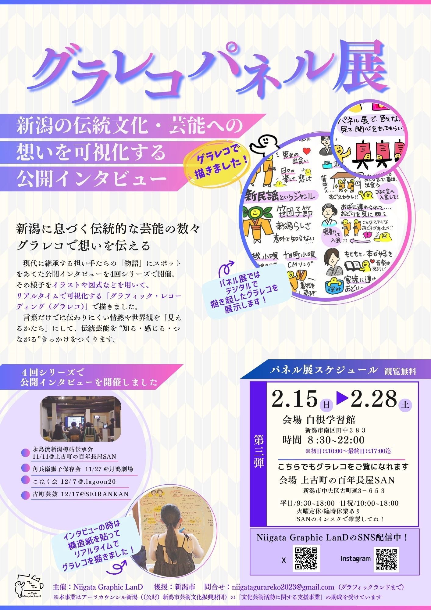 グラフィックレコーディング(グラレコ)をツールとして、豊かなコミュニケーションが生まれる土壌をつくる活動を行っているNiigata Graphic LanDが、新潟の伝統芸能を次世代へ継承する担い手の「物語」にスポットをあて、想いや挑戦を共有する公開インタビューイベントを、2025年11月から12月に、4回にわたって実施しました。インタビューの場でゲストのお話を「グラレコ」で描き出し、言葉だけでは伝わりにくい情熱や世界観を「見えるかたち」にした軌跡をパネルにして、巡回展を開催しています。
