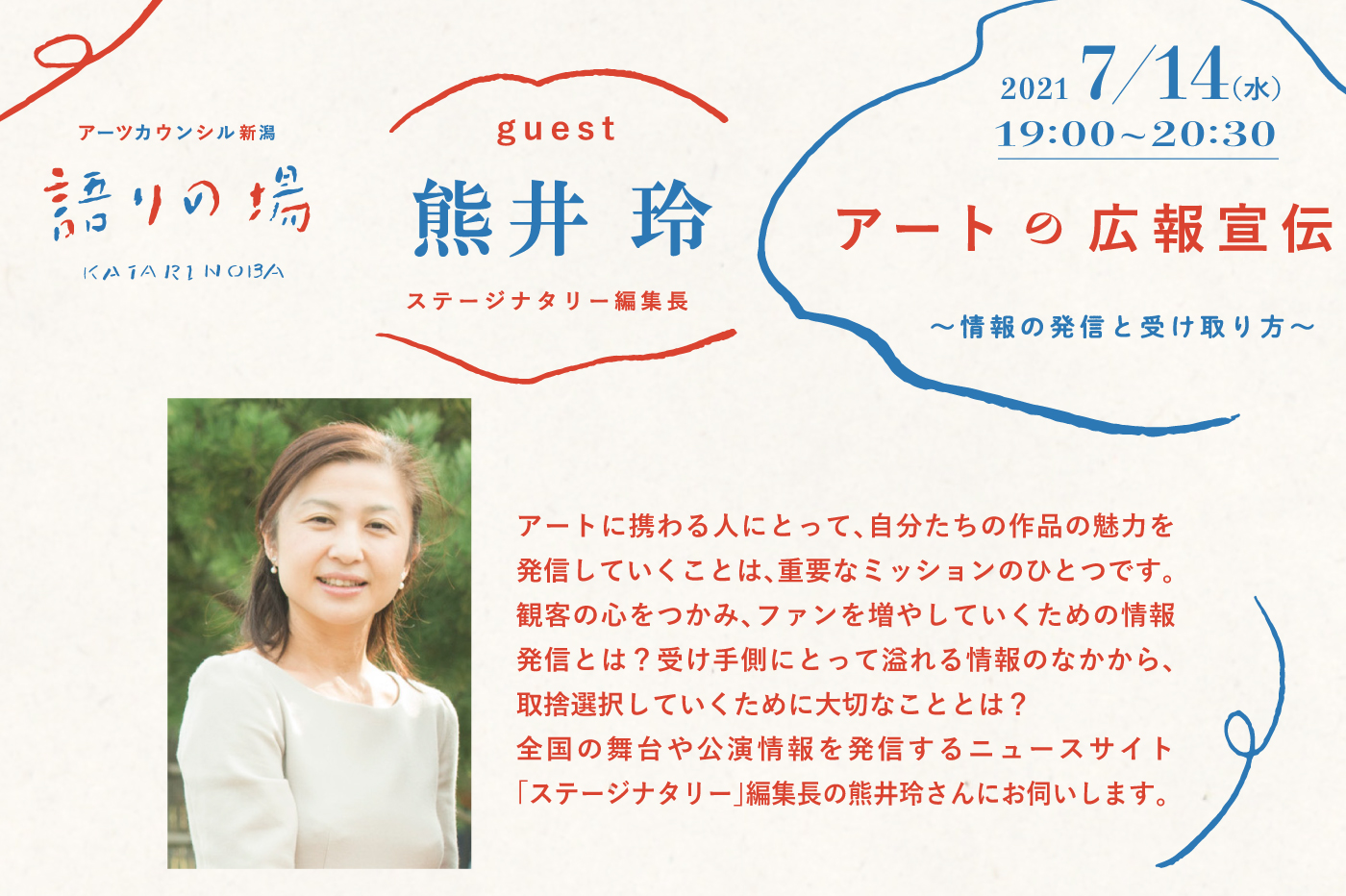7月14日は、テーマを「アートの広報宣言~情報の発信と受け取り方~」と題し、ゲストにステージナタリー編集長の熊井玲さんをお招きし、1時間半にわたり多くのことをお話いただいた。