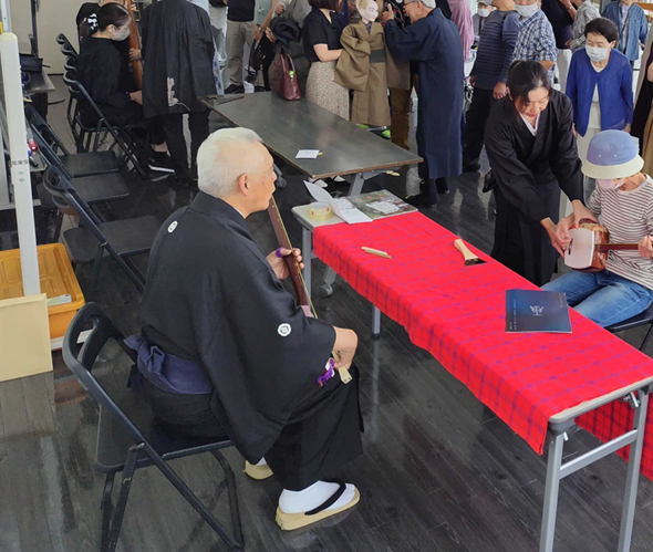 昨年度、学生等の若い世代の参加が少なかったことを受けて、今年度は公演日以外で古典芸能にふれる機会を創出するため、出前公演として学校訪問を企画しました。昨年度事業の広報等のつながりから、新潟県立新潟よつば学園の生徒、教員に琵琶と人形浄瑠璃の人形の解説・体験・実演を行いました。学校の授業で琵琶語りや人形浄瑠璃を学ぶことはあっても、実際にその技術や演奏を体験する機会はほとんどなく、今回は実際に琵琶や人形に触れながら学ぶことができ、感覚的に伝統芸能を体験する貴重な機会となったという声をいただきました。団体としても、「誰もが安心して楽しめる公演」を行うために必要なことを考えるきっかけをいただきました。さまざまな障がいへの対応を学ぶと同時に、目の前の人が、何に不安を感じ、何を望んでいるのかを考えることの大切さにも気づくことができました。
